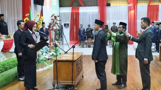 Didampingi Wakil Ketua I Harmuni dan Wakil Ketua II H. Bahriannoor, prosesi kemudian dilanjutkan dengan pengambilan sumpah/janji, penyematan pin DPRD, serta penandatanganan berita acara oleh Ketua DPRD Batola.