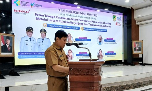MUARA TEWEH, baritobersinar.news – Sekretaris Daerah Kabupaten Barito Utara, Drs. Muhlis melalui staf ahli bidang hukum dan politik, Drs H Ardian membuka secara resmi kegiatan Pelatihan Aksi Cegah Stunting di Gedung Balai Antang Muara Teweh, Selasa (14/10/2025).