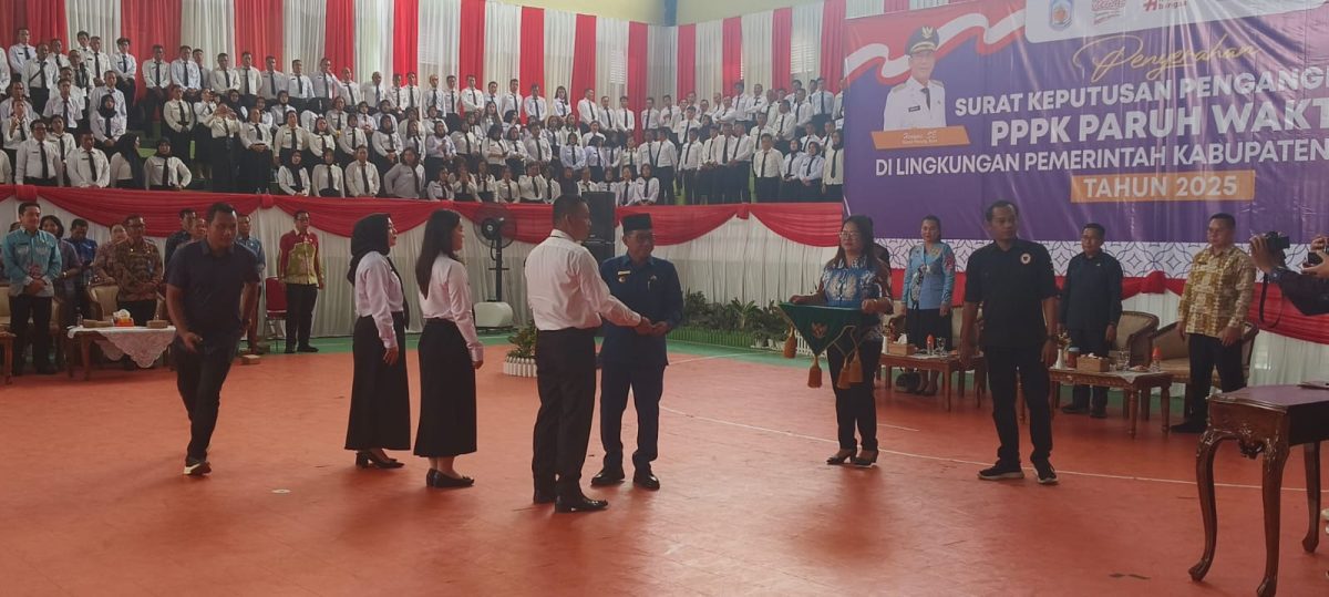 PURUK CAHU, baritobersinar.news – Pemerintah Kabupaten (Pemkab) Murung Raya resmi melantik 1.313 Pegawai Pemerintah dengan Perjanjian Kerja (PPPK) Paruh Waktu formasi tahun berjalan. Pelantikan dan penyerahan Surat Keputusan (SK) dilakukan langsung oleh Bupati Murung Raya, Heriyus, di GOR Tana Malai Tolung Lingu, Kamis (6/11/2025).